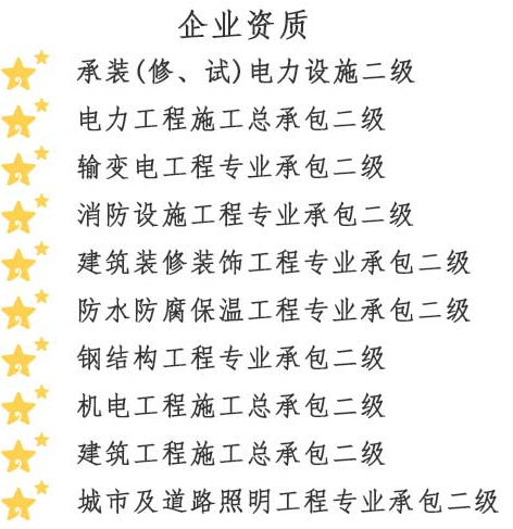 金楓電力集團(tuán)有限公司,成立于2015年5月28日,注冊(cè)資金6060萬(wàn)元,是一家專(zhuān)業(yè)從事電力工程施工的集團(tuán)化公司。公司經(jīng)營(yíng)范圍包括:電氣安裝服務(wù);建設(shè)工程施工;輸電、供電、受電電力設(shè)施的安裝、維修和試驗(yàn);測(cè)繪服務(wù);建筑勞務(wù)分包;建筑工程設(shè)計(jì);發(fā)電機(jī)及發(fā)電機(jī)組制造;建筑工程機(jī)械與設(shè)備租賃;工業(yè)工程設(shè)計(jì)服務(wù);技術(shù)服務(wù)、技術(shù)開(kāi)發(fā)、技術(shù)咨詢(xún)、技術(shù)交流、技術(shù)轉(zhuǎn)讓、技術(shù)推廣等。公司持有國(guó)家能源局頒發(fā)的承裝(修、試)電力設(shè)施許可證,承裝類(lèi)二級(jí)、承修類(lèi)二級(jí)、承試類(lèi)二級(jí)資質(zhì);電力工程施工總承包二級(jí)資質(zhì);輸變電工程專(zhuān)業(yè)承包二級(jí)資質(zhì);建筑裝修裝飾工程專(zhuān)業(yè)承包二級(jí)資質(zhì);消防設(shè)施工程專(zhuān)業(yè)承包二級(jí)資質(zhì);防水防腐保溫工程專(zhuān)業(yè)承包二級(jí)資質(zhì);施工勞務(wù)資質(zhì);機(jī)電工程施工總承包二級(jí);建筑工程施工總承包二級(jí);城市及道路照明工程專(zhuān)業(yè)承包二級(jí);鋼結(jié)構(gòu)工程專(zhuān)業(yè)承包二級(jí)資質(zhì);公司已通過(guò)質(zhì)量管理體系認(rèn)證、環(huán)境管理體系認(rèn)證及職業(yè)健康安全管理體系認(rèn)證。并獲得省級(jí)信用評(píng)價(jià)AAA證書(shū);連續(xù)多年納稅信用評(píng)價(jià)A級(jí)。